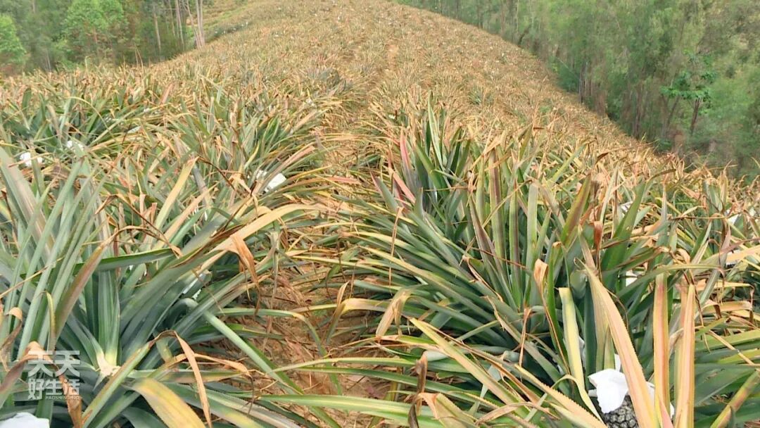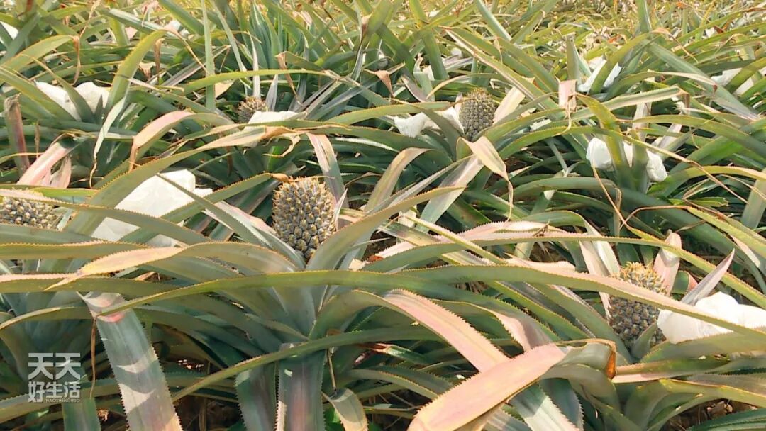 菠萝怕晒,每一个菠萝“头上”,果农早早就帮忙戴上了“防晒帽”来遮挡烈日。看这漫山遍野的菠萝,防晒工程也不小。